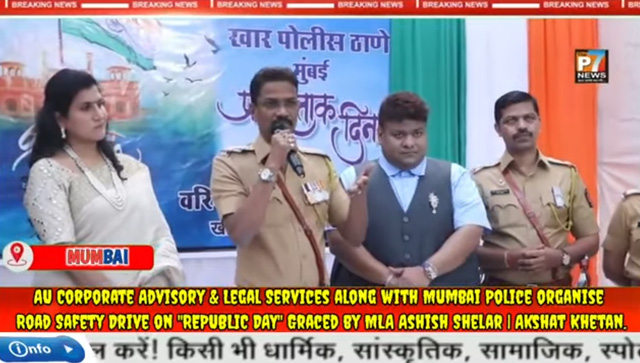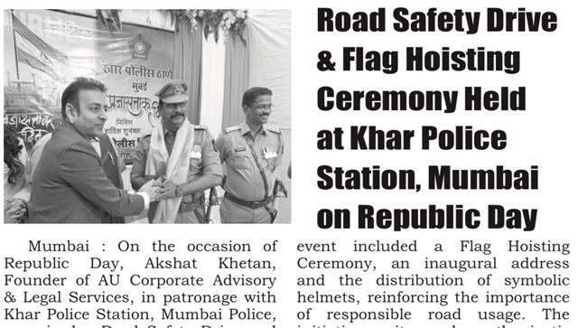 On the occasion of Republic Day, Mr. Akshat Khetan, Founder of AU Corporate Advisory & Legal Services, in association with Khar Police Station, Mumbai Police, helped organise a Road Safety Drive and Flag Hoisting Ceremony, promoting public safety and responsible citizenship. (Publication - Active Times,28 January 2026,Pg.06.)
