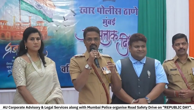 On the occasion of Republic Day, Mr. Akshat Khetan, Founder of AU Corporate Advisory & Legal Services, in association with Khar Police Station, Mumbai Police, organised a Road Safety Drive and Flag Hoisting Ceremony to promote civic responsibility and road safety awareness.