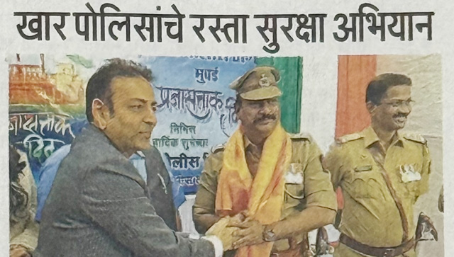 खार पोलिसांच्या पुढाकारातून प्रजासत्ताक दिनानिमित्त आयोजित रस्ता सुरक्षा अभियान उत्साहात आणि सामाजिक जाणीवेने साजरे करण्यात आले. AU Corporate Advisory and Legal Services चे संस्थापक श्री. अक्षत खेतान यांच्या उपस्थितीत पार पडलेल्या या उपक्रमाने जबाबदार वाहनचालकता, रस्ता सुरक्षेचे महत्त्व आणि नागरिक–पोलीस सहकार्याचा मजबूत संदेश दिला. (Publication - Aple Samrajya,28 January 2026,Pg.08)