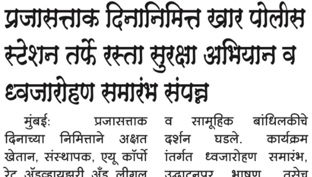 प्रजासत्ताक दिनानिमित्त खार पोलीस स्टेशनतर्फे आयोजित रस्ता सुरक्षा अभियान व ध्वजारोहण समारंभ अभिमानाने पार पडला या उपक्रमात AU Corporate Advisory and Legal Services चे संस्थापक श्री. अक्षत खेतान यांची प्रमुख उपस्थिती लाभली. नागरिकांमध्ये रस्ता सुरक्षेबाबत जागरूकता निर्माण करणे, जबाबदार वाहतूक संस्कृतीला प्रोत्साहन देणे आणि नागरिक-पोलीस सहकार्य दृढ करणे हा या कार्यक्रमाचा मुख्य उद्देश होता. (Publication - Global Times,28 January 2026,Pg.04)