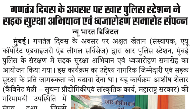 गणतंत्र दिवस के अवसर पर खार पुलिस स्टेशन, मुंबई में आयोजित सड़क सुरक्षा अभियान एवं ध्वजारोहण समारोह में Mr. Akshat Khetan, Founder of AU Corporate Advisory and Legal Services की गरिमामयी उपस्थिति ने कार्यक्रम की शोभा बढ़ाई। नागरिक जिम्मेदारी और सुरक्षित भारत का सशक्त संदेश। (Publication - New Bharat Digital,29 January 2026,Pg.02)