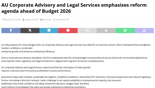 Mr. Akshat Khetan, Founder of AU Corporate Advisory and Legal Services, calls for an execution-led reform agenda ahead of Budget 2026 to strengthen investor confidence and boost enterprise growth.