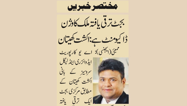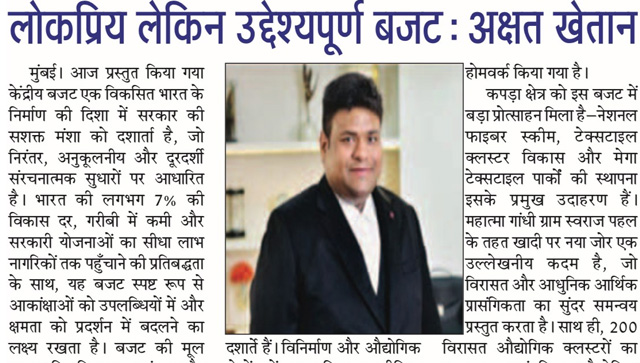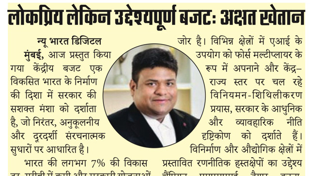 लोकप्रिय लेकिन उद्देश्यपूर्ण बजट” विकास, रोज़गार और औद्योगिक प्रगति को नई दिशा देता हुआ। MSME और इंफ्रास्ट्रक्चर पर मजबूत फोकस। अक्षत खेतान, Founder, AU Corporate Advisory & Legal Services (Publication - Dabang Dunia,02 February 2026,Pg.03)