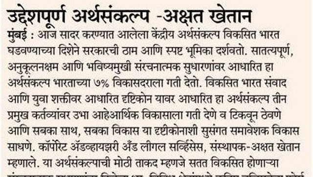 रोजगारनिर्मिती, उद्योगविकास आणि तंत्रज्ञानाधारित प्रगतीला चालना देणारा दूरदर्शी अर्थसंकल्प. वाढ आणि स्थैर्य यांचा संतुलित दृष्टिकोन. अक्षत खेतान, AU Corporate Advisory & Legal Service (Publication - Pudhari,02 February 2026,Pg.04)