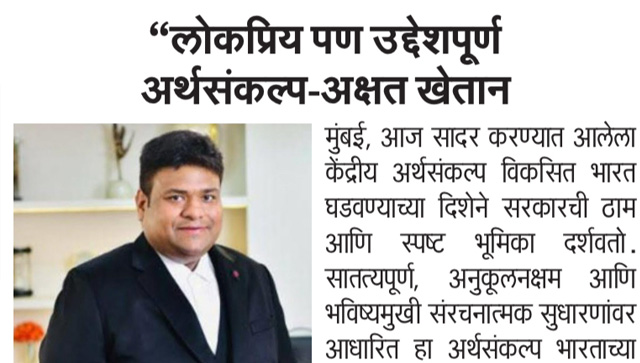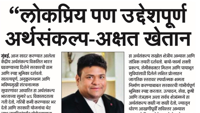 लोकप्रियतेसोबतच स्पष्ट उद्दिष्टे आणि दीर्घकालीन विकासाचा ठाम आराखडा मांडणारा हा अर्थसंकल्प भारताच्या प्रगतीला नवी गती देणारा ठरतो. पायाभूत सुविधा, उद्योगवृद्धी आणि भविष्यातील तांत्रिक तयारी यावर दिलेला भर देशाच्या आर्थिक बळकटीस हातभार लावणार आहे. Akshat Khetan, संस्थापक AU Corporate Advisory and Legal Services, यांच्या मते हा अर्थसंकल्प भारताला जागतिक स्तरावर अधिक सक्षम बनवण्याची दिशा दाखवतो.