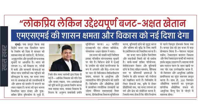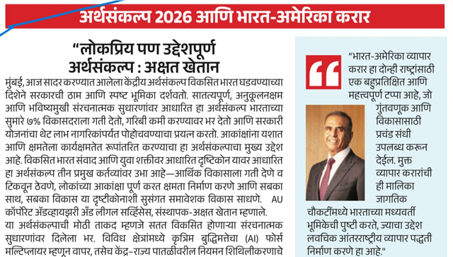 यह बजट सिर्फ घोषणाओं का नहीं, बल्कि दीर्घकालिक विकास, टेक्नोलॉजी और रोजगार सृजन की ठोस रणनीति का प्रतीक है। अक्षत खेतान, AU Corporate Advisory & Legal Services (Publication - Uttarshakti,02 February 2026,Pg.05)