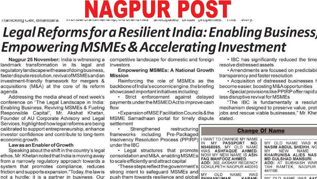 Mr. Akshat Khetan, Founder of AU Corporate Advisory and Legal Services, highlights how India’s evolving legal reforms are strengthening business foundations. He outlines the transformative impact of MSME empowerment, faster dispute resolution and investor-friendly policies. A roadmap that positions India for resilient growth and accelerated investment.