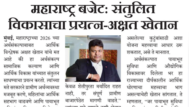 महाराष्ट्राचा २०२६ चा अर्थसंकल्प सामाजिक कल्याण आणि विकास यांचा समतोल राखणारा असल्याचे AU Corporate Advisory and Legal Services चे संस्थापक श्री. अक्षत खेतान यांनी नमूद केले. ग्रामीण अर्थव्यवस्था, शेतकरी सहाय्य, महिला सक्षमीकरण आणि पायाभूत सुविधांवर दिलेला भर राज्याच्या भविष्यातील आर्थिक स्थैर्यासाठी महत्त्वाचा ठरणार आहे.